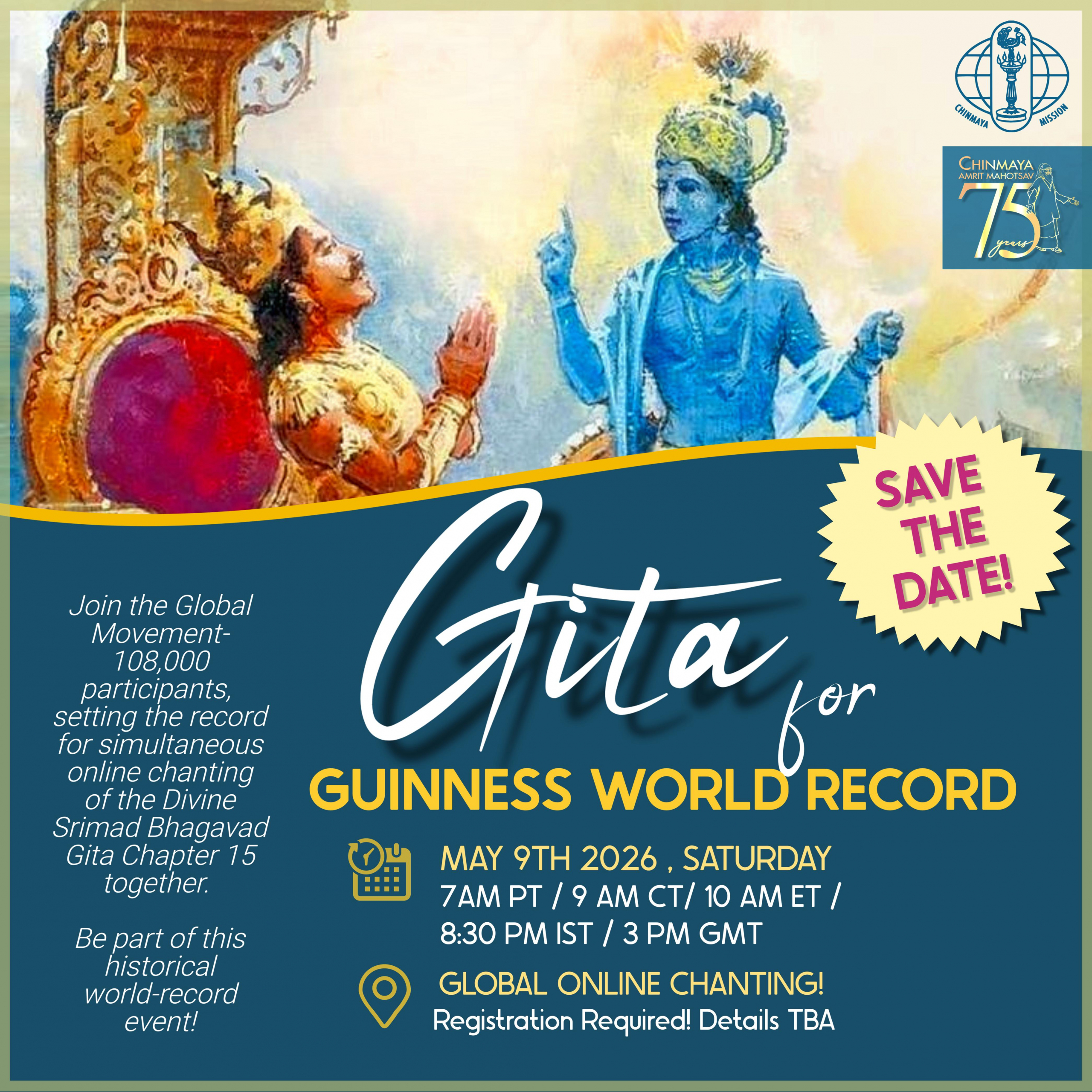 Guiness World Record Attempt By Chinmaya Mission For Most people chanting online simultaneously (Target: 108,000 participants) - Group Chanting of CHAPTER 15 - Puruṣhottama Yoga The participants for this event will be across the globe in various timezones. Globally Event Registration is required.