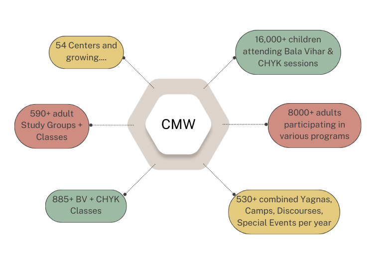 In keeping with the vision of Pujya Gurudev, which has been the founding principle for Chinmaya Mission, the 50+ centers of CMW across North America and the Caribbean Islands conduct several impactful programs across all age groups. These programs have had a profound and deep impact on individuals, families and the society in which they live in. To read more about these programs, please visit https://chinmayamissionwest.org.