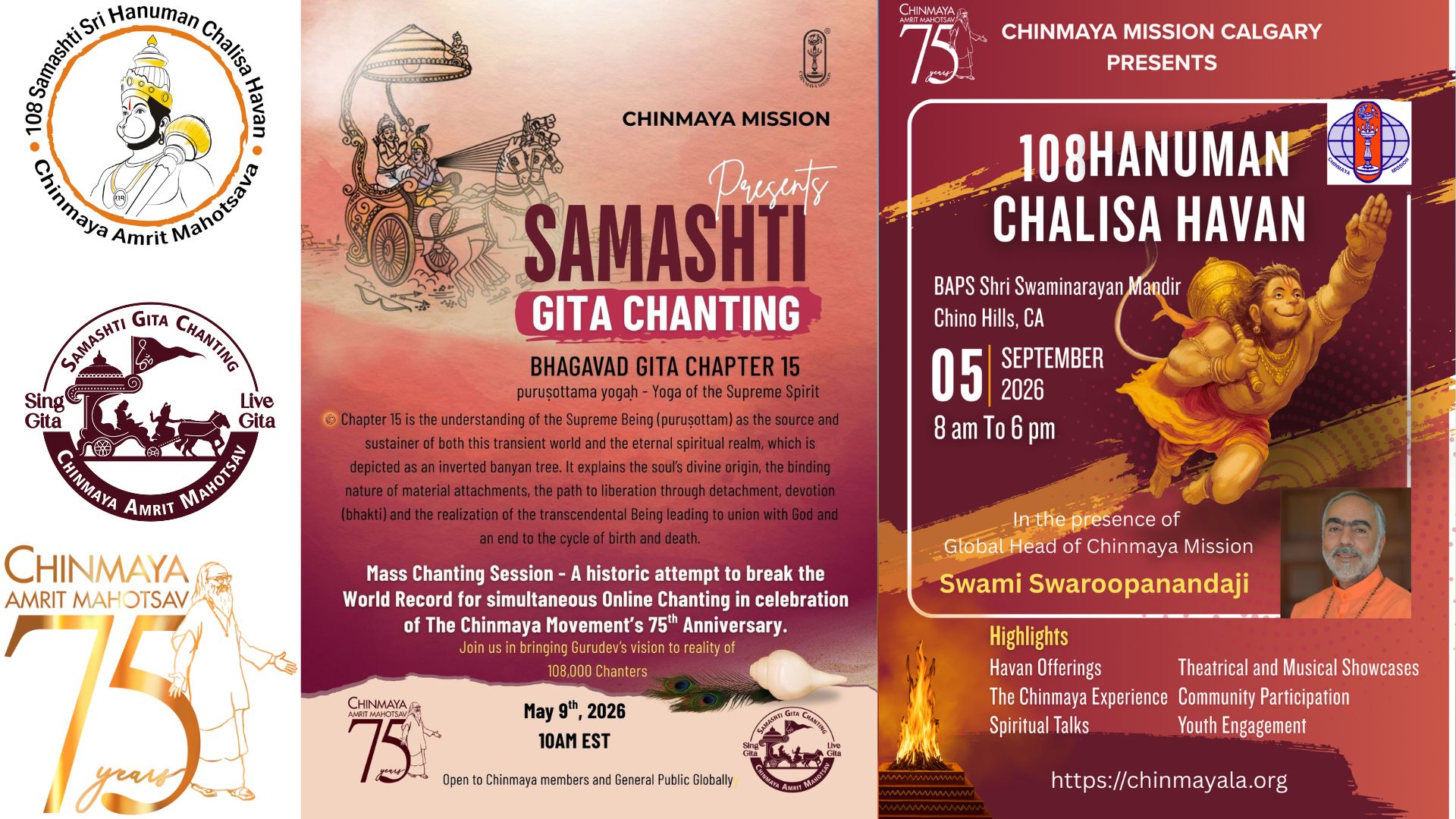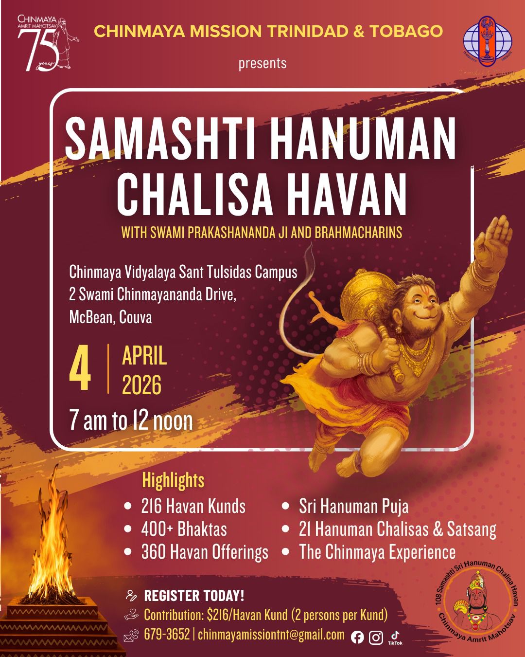 Hari Om! 🙏🔥 Shri Hanuman Bhaktas, the moment has arrived… As we step into 2026 — the 75th year of Chinmaya Mission Global — we gather in honour of Hanuman Jayanti 2026 for a grand, joy-filled, vibration-raising🔥SAMASHTI HANUMAN CHALISA HAVAN!🔥 🐒 Let your devotion roar like Hanuman Ji’s name as we chant, offer and uplift…