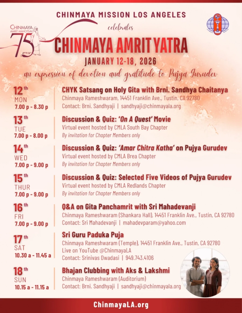 All are welcome with love for a 7 day celebration of the Chinmaya Amrit Yatra, an offering of devotion and gratitude to Pujya Gurudev.