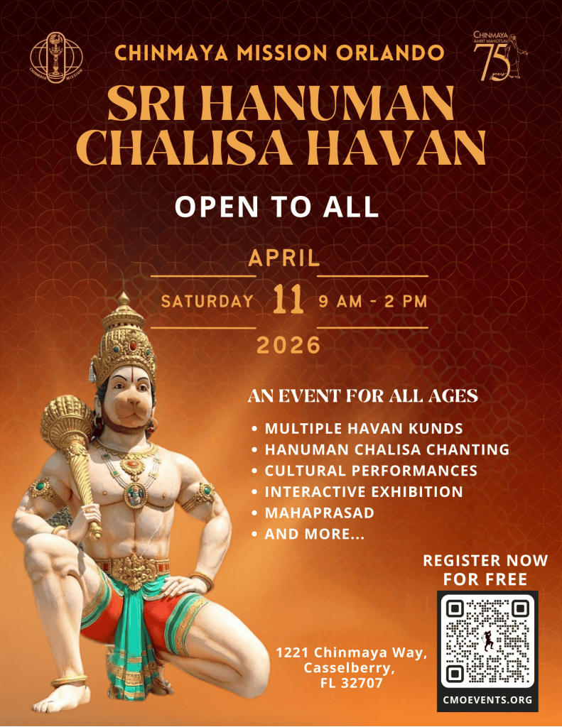 The year 2026 will mark 75 years of Chinmaya Mission’s divine service. To honor this historic milestone, please join us for the Sri Hanuman Chalisa Havan, an offering of devotion and strength, a collective spiritual invocation seeking inner courage, purity, and divine grace. The sacred chanting of the Hanuman Chalisa represents the purification of the mind and embodies unwavering faith in the Divine. The Havan intensifies the sanctity of the chants, transforming the experience into a purifying act of devotion and offering, and creating a powerful atmosphere of positive energy.