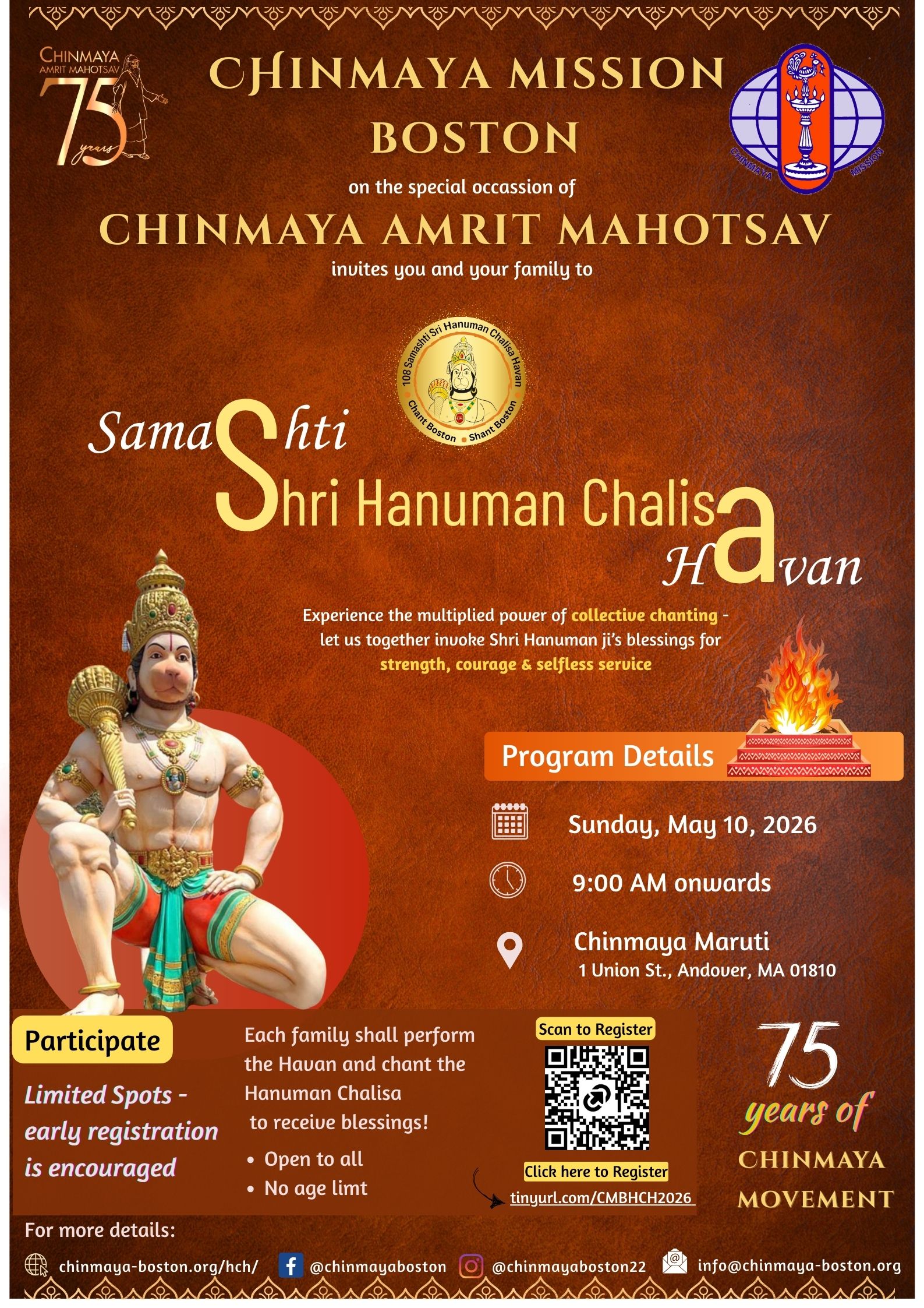 FeaturedChinmaya Maruti 1 Union St, Andover, Boston, MA, United StatesHanuman Chalisa HavanChinmaya Mission Boston invites you with your family and friends to participate in the Hanuman Chalisa Havan. Limited spots available, register early to ensure you and your family can together perform the havan and receive the blessings of Hanumanji. Registration link is : https://tinyurl.com/CMBHCH2026.