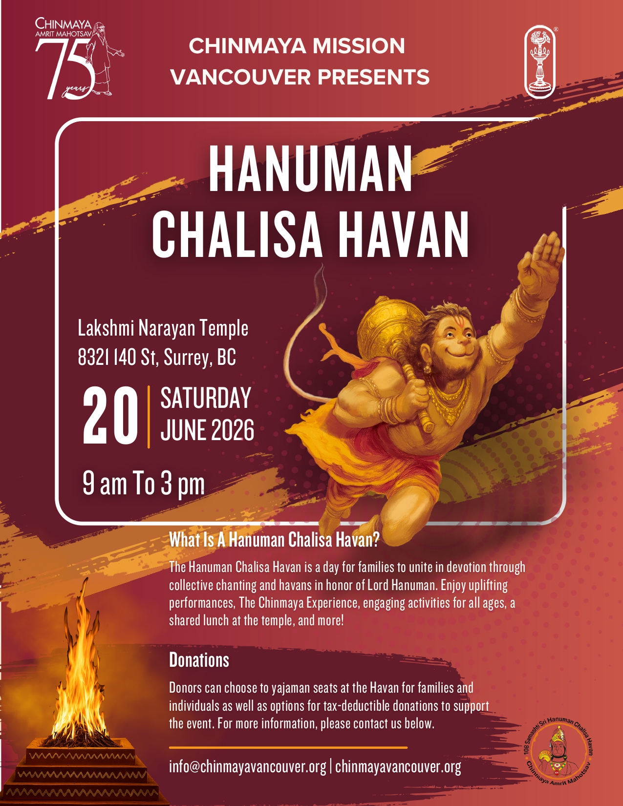 Hanuman Chalisa Havan – CM Vancouver Featured June 20 @ 9:00 am - 3:00 pm Lakshmi Narayan Temple 8321 140 St., Surrey, BC Hanuman Chalisa Havan Free